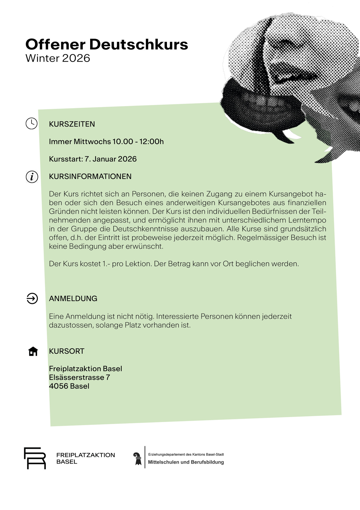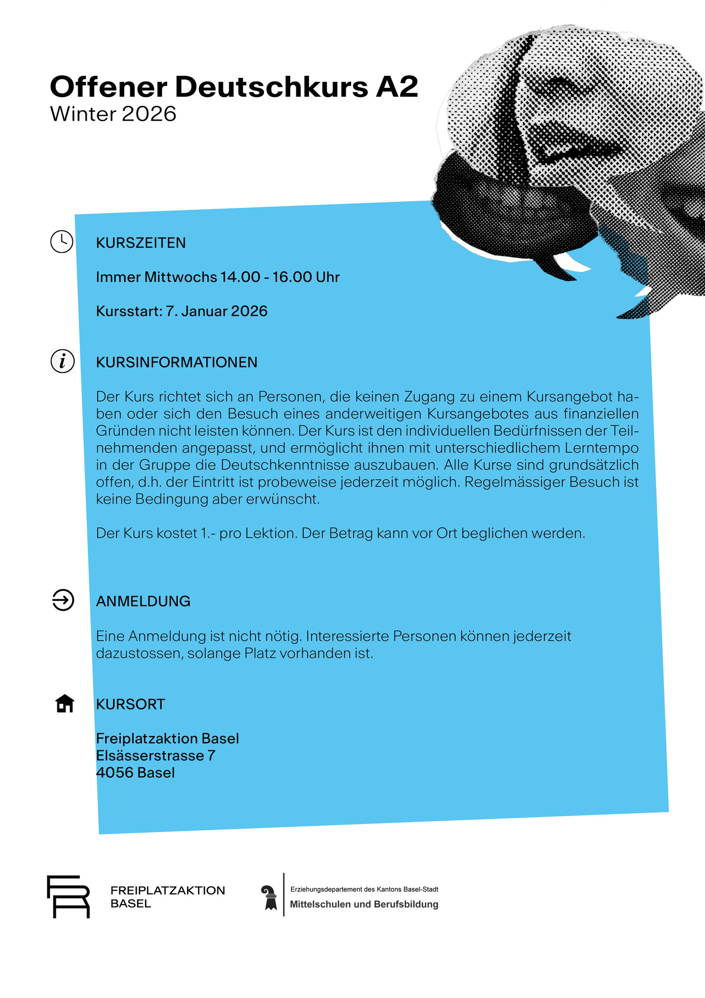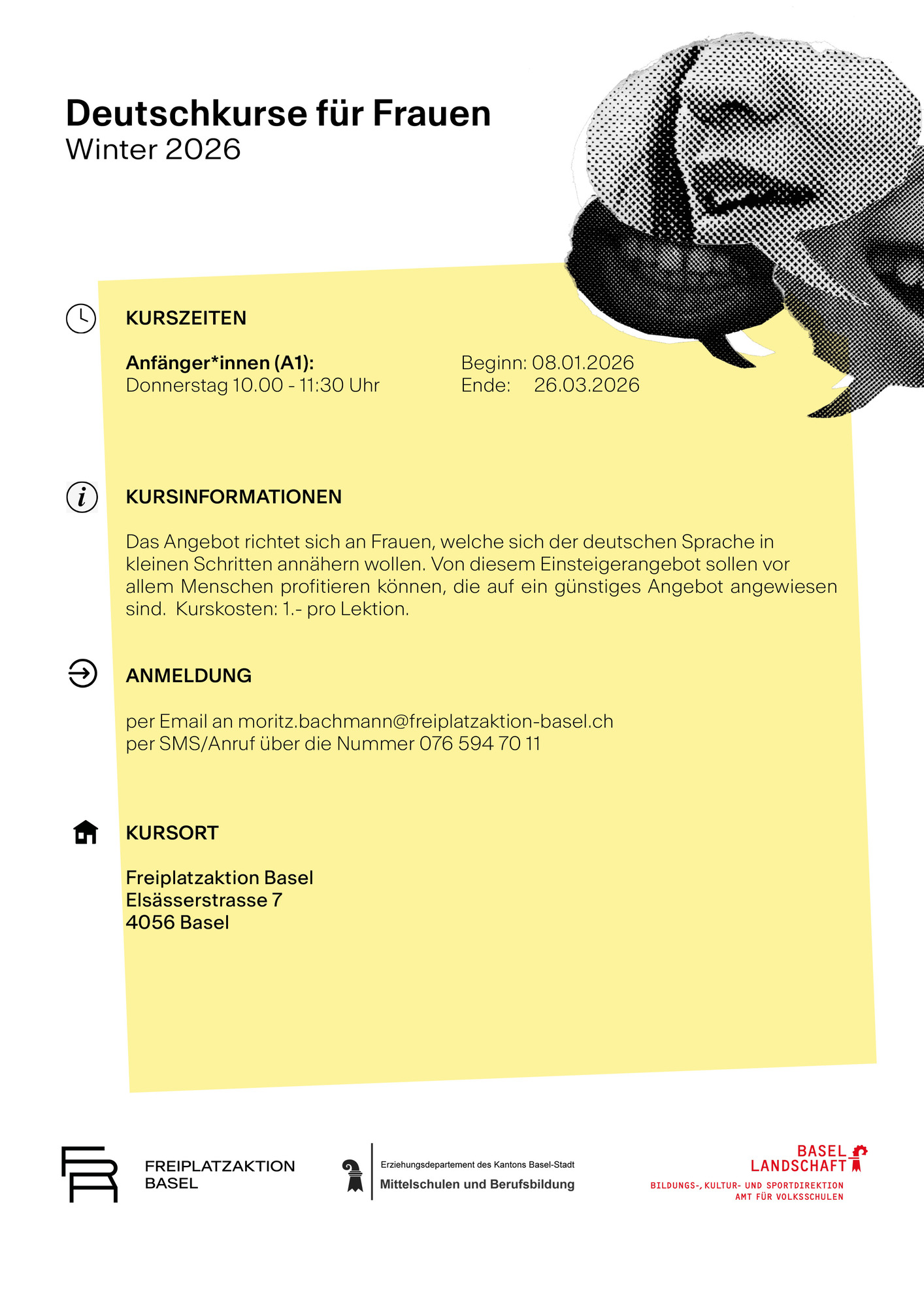 Alle Kurse finden in der Freiplatzaktion Basel, Elsässerstrasse 7, 4056 Basel statt.